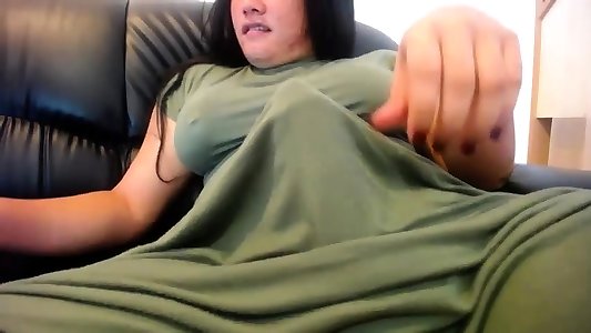 Knob loving Chinese transgender princess swallows a large milky knob on the sofa