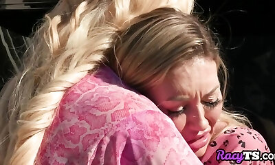 deux demoiselles aux gros seins écrasées par 2 transexuelles aux gros seins à l'extérieur dans le parc