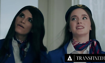 прелестная грудастая молодая стюардесса наслаждается жестким сексом со своим очаровательным коллегой-трансвеститом-брюнеткой